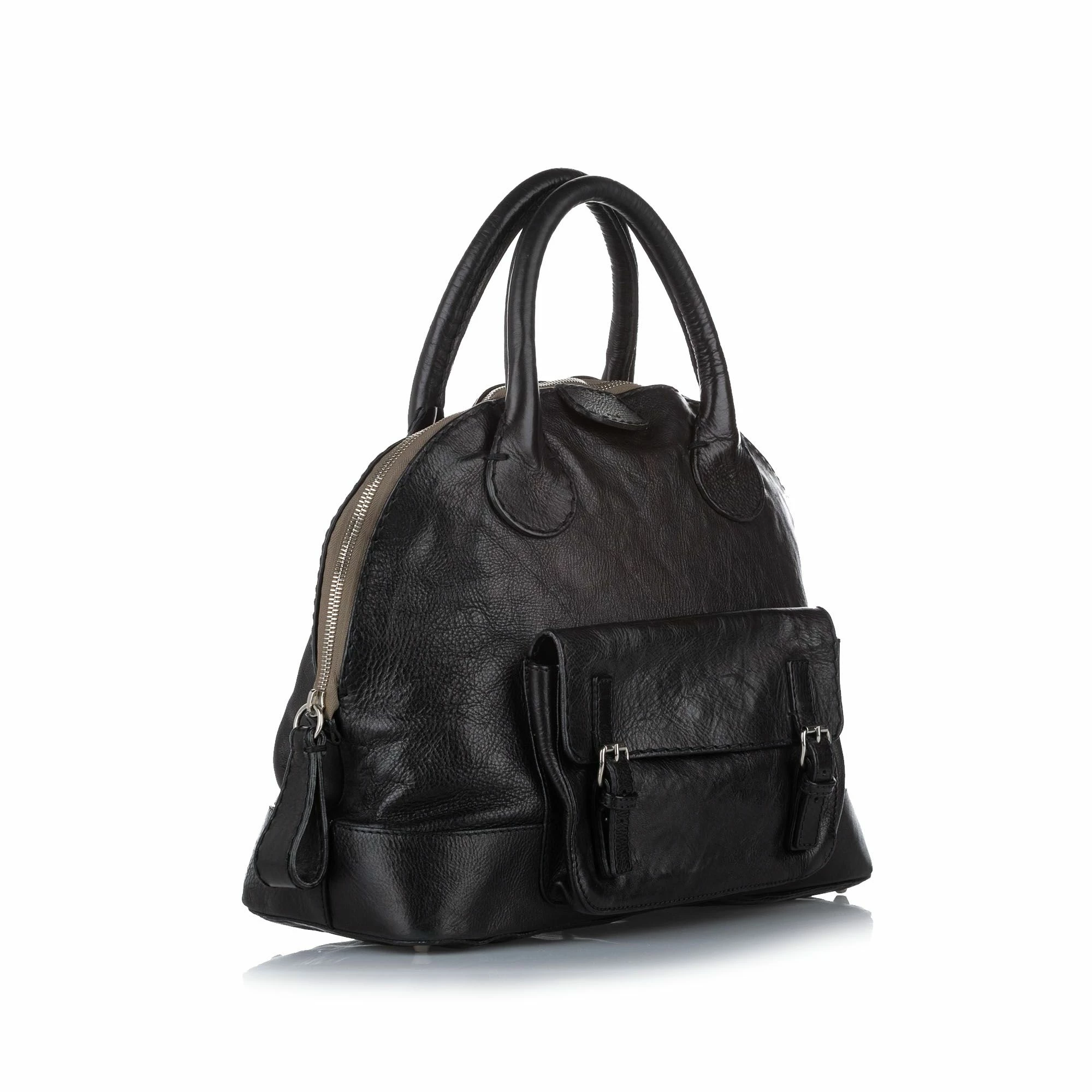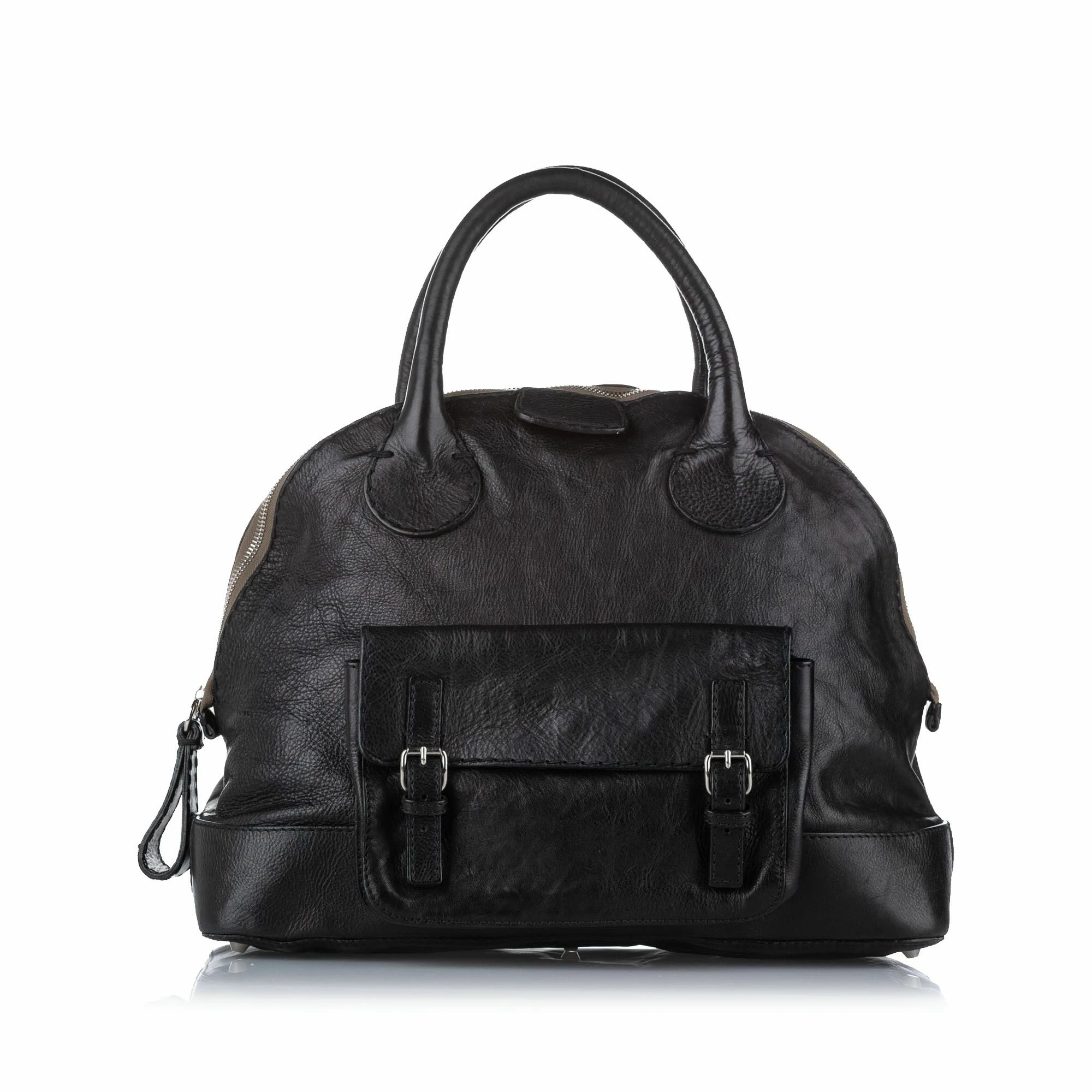 VINTAGE. RRP AS NEW. The Edith features a leather body, a front exterior flap pocket, rolled leather handles, a top zip closure, and an interior zip pocket.Exterior back is discolored and out of shape. Exterior bottom is discolored. Exterior front is discolored and out of shape. Exterior handle is discolored. Exterior side is out of shape. Zipper is scratched and tarnished.