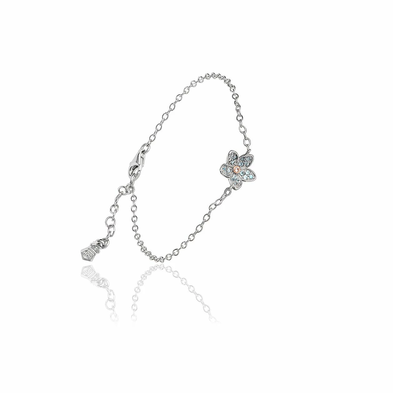 For centuries forget-me-not blossoms have been worn as a sign of enduring love – now wear our stylish version of the flower in sterling silver and rose gold, studded with sparkling gem stones on its petals. This beautiful bracelet reflects the delicate charm of the forget-me-not, which symbolises faithfulness and a connection that lasts through time.