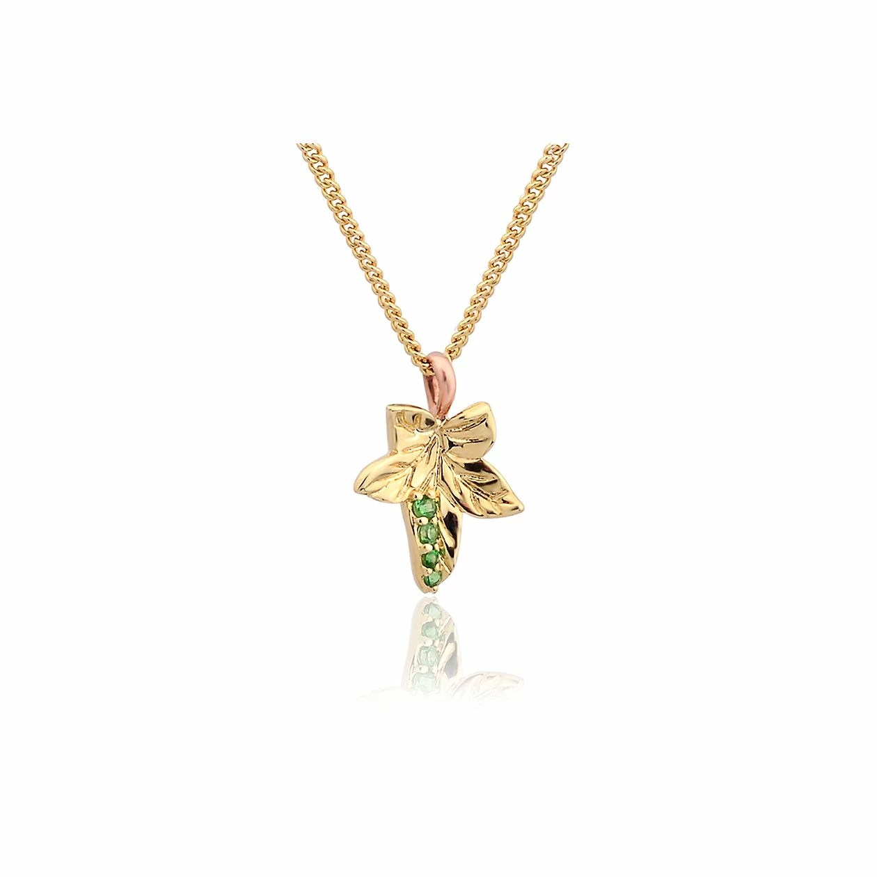 The evergreen ivy symbolises eternity and strong attachment – and now let our 9ct golden version of the leaf weave its magic on you. A delicately fashioned ivy leaf is given added sparkle with three green gems on this stylish golden pendant, finished with a rose gold stem and worn on a matching gold chain.