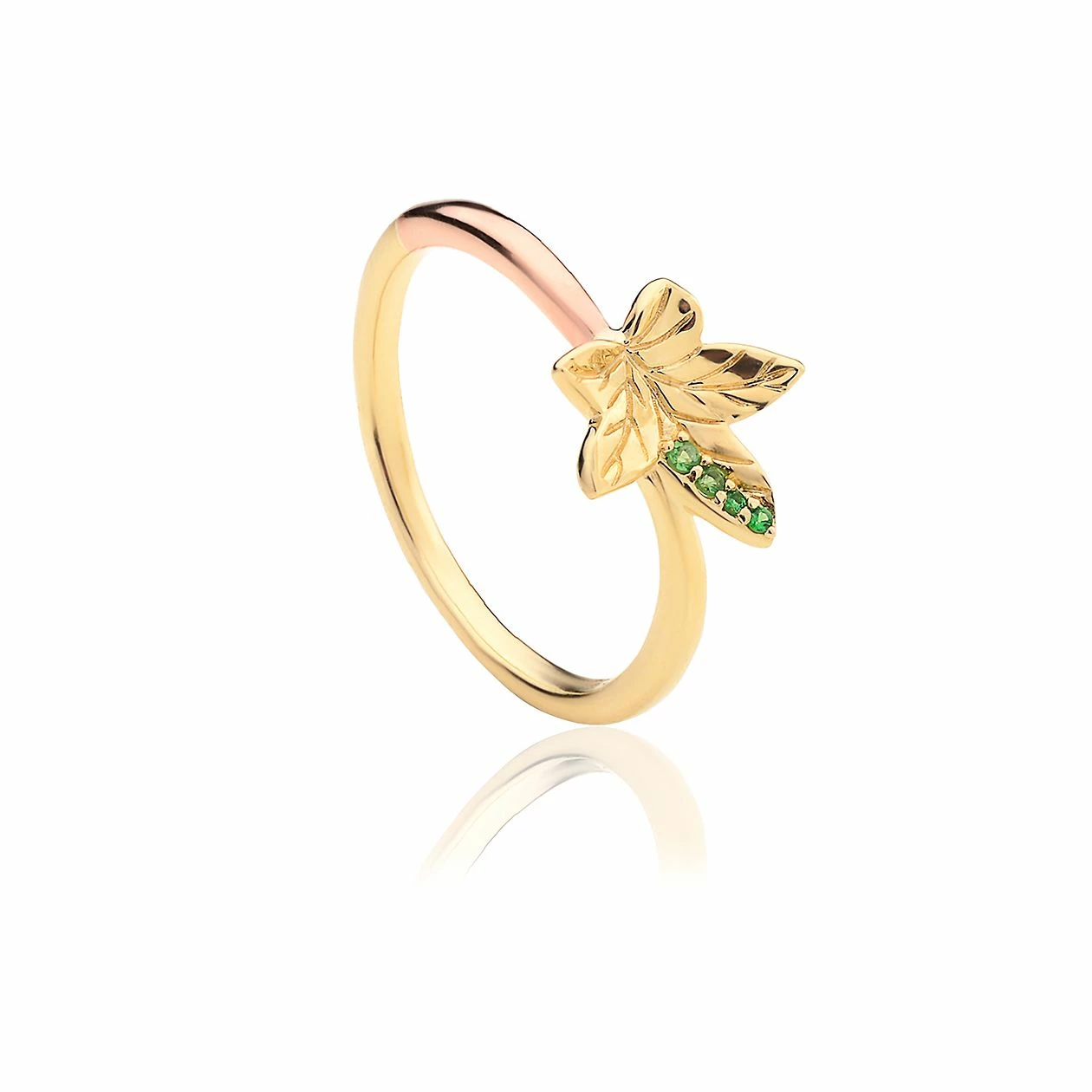 The evergreen ivy symbolises eternity and strong attachment – and now let our 9ct golden version of the leaf weave its magic on you. Our delicately fashioned ivy leaf is given added sparkle with four green gems, finished with a rose gold stem on this dazzling ring.