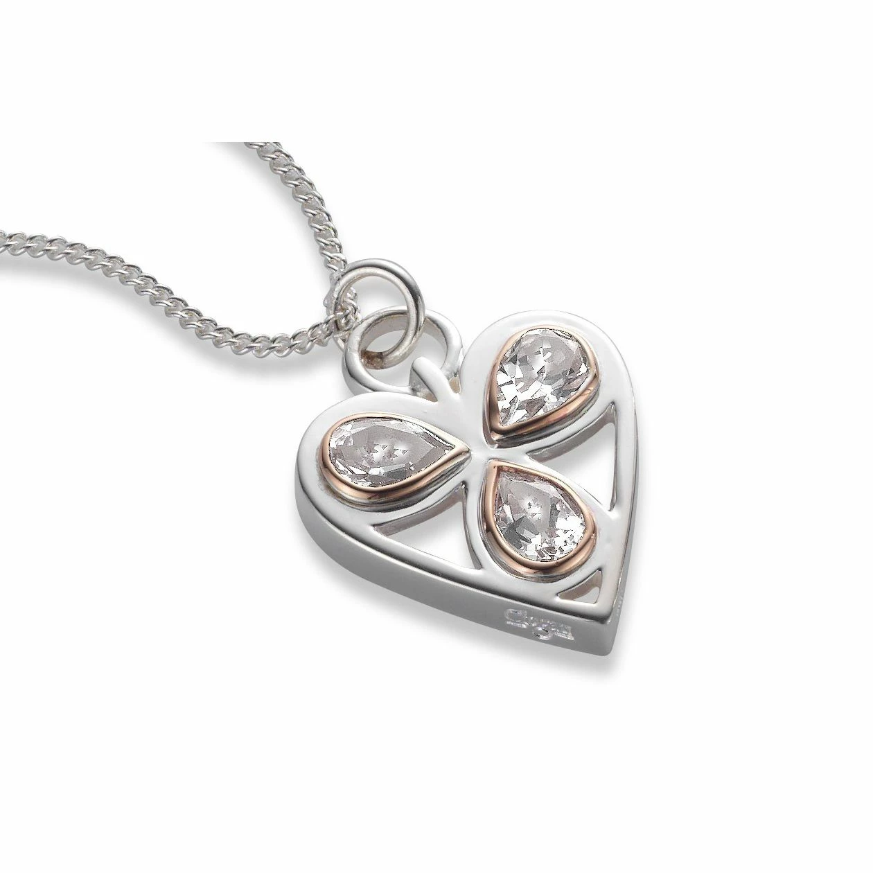 Celebrating Wales’ three highest peaks – Snowdon (Yr Wyddfa), Garnedd Ugain and Carnedd Dafydd – the Heart of Wales pendant features three faceted, pear-shaped clear quartz stones, each set in a rose gold bezel. Hanging freely on a 46cm(18″”) silver curb chain, the shimmering gems sit perfectly within a silver heart-shaped motif. Here in Wales, the gold lies deep in the mountain alongside seams of copper and granite quartz. It is this elemental combination that is invoked in the magical Heart of Wales collec