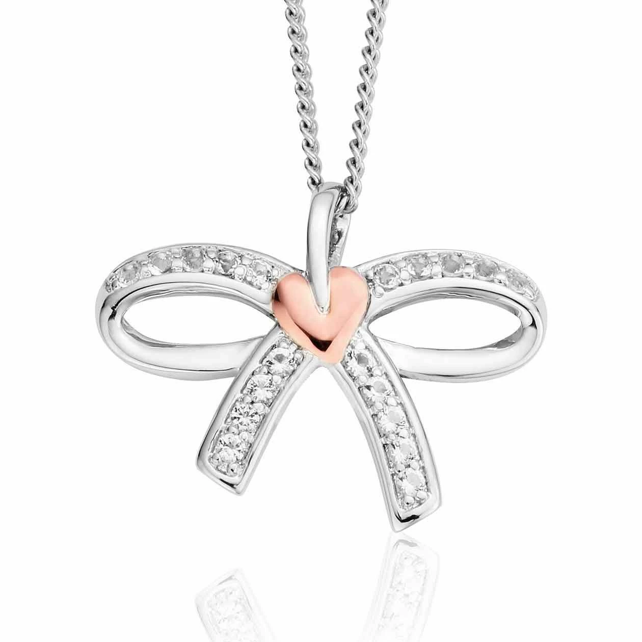 The classical bow motif represented in this stylish pendant shares its familiarity with all ages and its heritage with the iconic Tree of Life design of natural intertwining vines and leaves, delicately combined. This elegant, contemporary silver and rose gold pendant is set with white topaz and contains rare Welsh gold – the Gold of Royalty for over 100 years. The pendant hangs freely on a 46cm (18″”) silver curb chain. The perfect accessory to complement any outfit for any occasion. Classic design never dates.