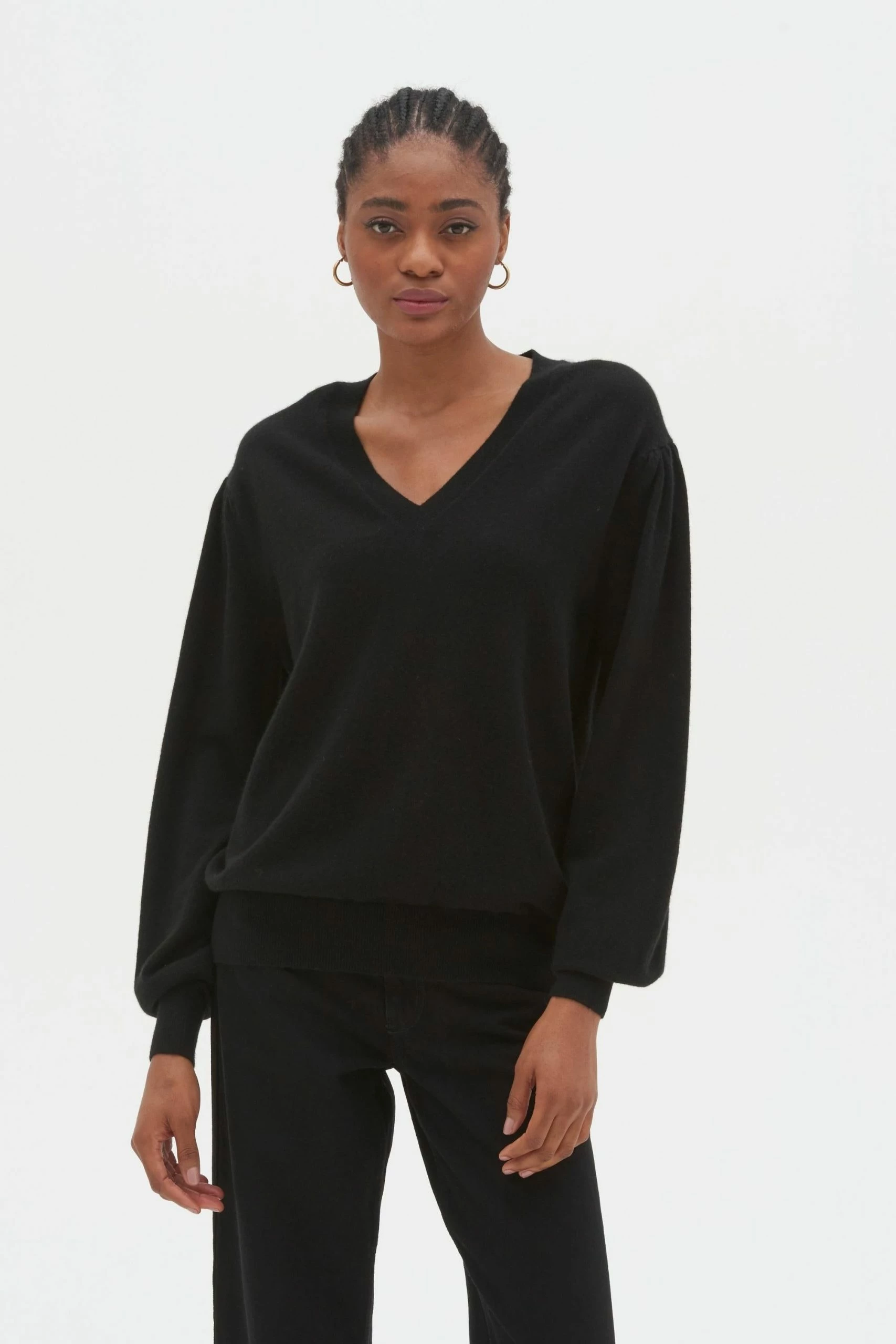 Suits everyone v neck sweater with an easier fit through the body, a deeper but not too deep, v neck, gently gathered shoulder and relaxed blouson sleeve. This sweater is softer than soft and makes your work to weekend dressing simple, easy and stylish.
