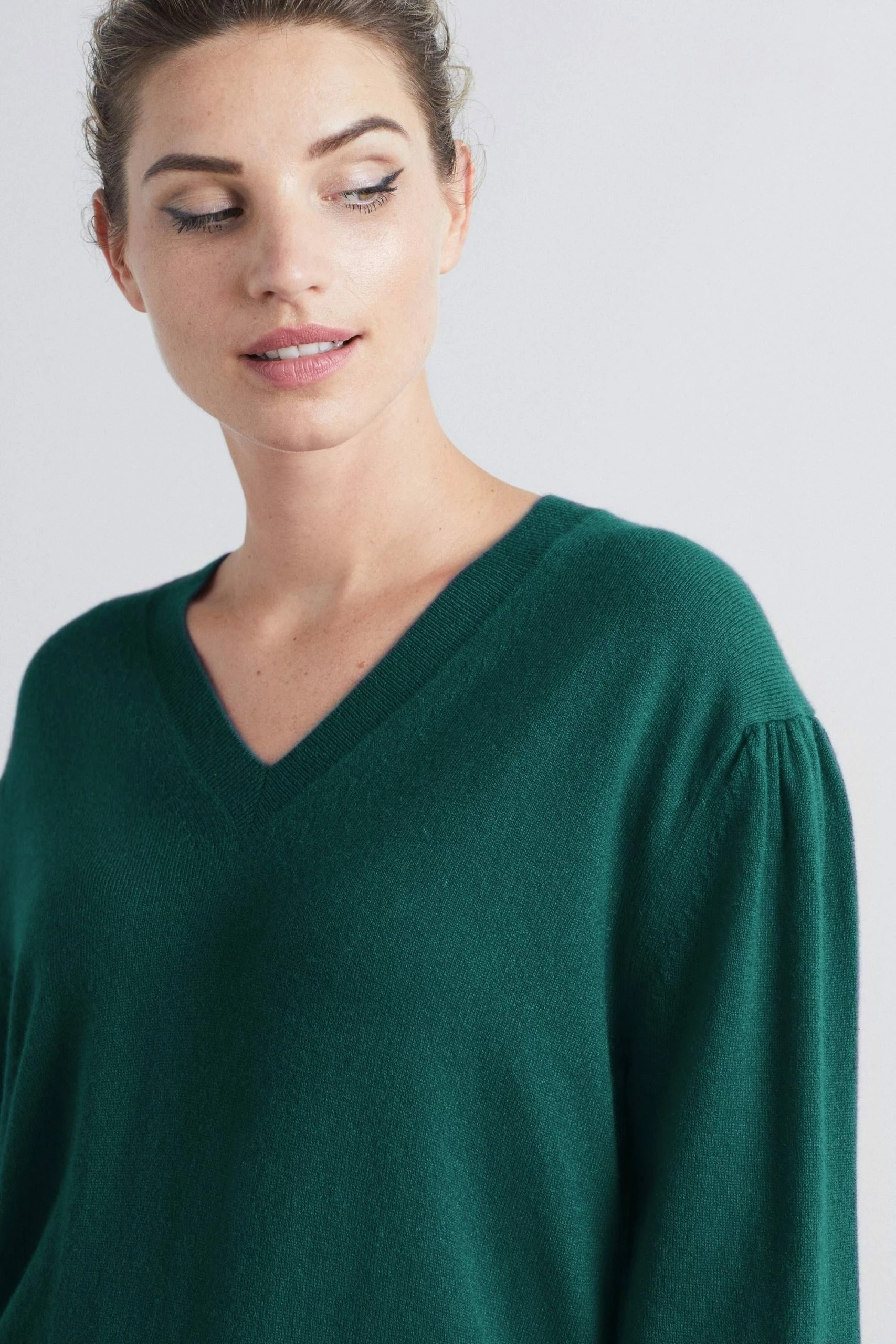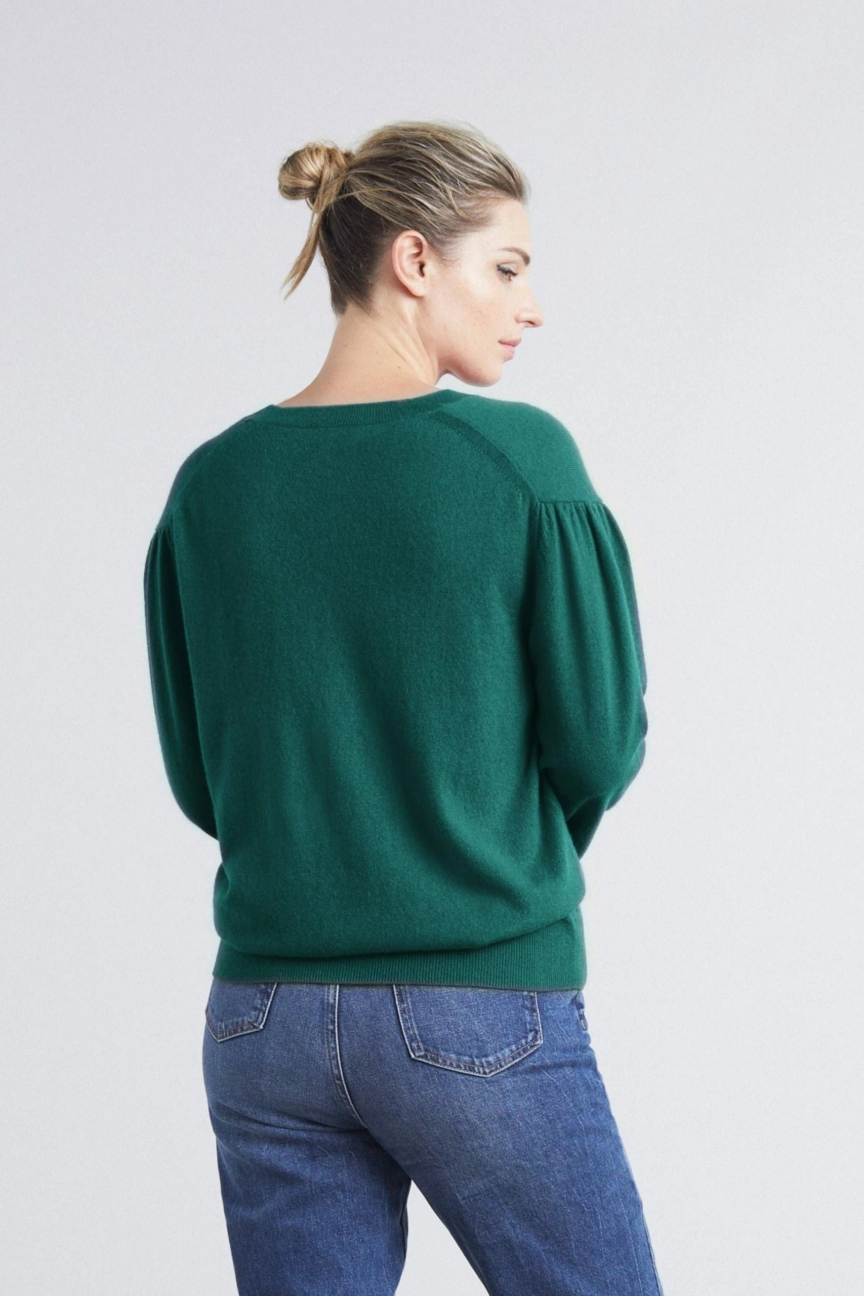 Suits everyone v neck sweater with an easier fit through the body, a deeper but not too deep, v neck, gently gathered shoulder and relaxed blouson sleeve. This sweater is softer than soft and makes your work to weekend dressing simple, easy and stylish.